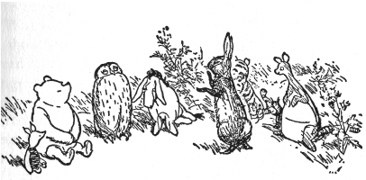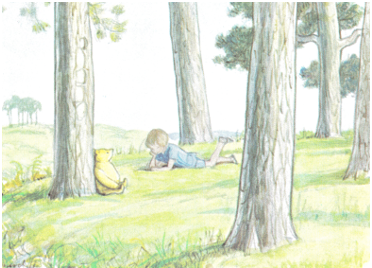 Milne cannot bear to have Christopher say goodbye to Pooh, so the book ends with Christopher Robin saying, “Come on!” “Where?” says Pooh. “Anywhere,” responds Christopher Robin. Milne optimistically declares, “Whatever happens to them on the way, in that enchanted place on top of the forest, a little boy and his Bear will always be playing.”1